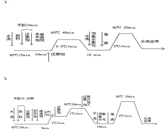 a 、織物進缸熱水洗5分鐘,加入緩染劑,同時還原染料用酒精在化料槽內打漿溶解。加入燒堿、保險粉干缸還原10分鐘,缸內待室溫時,將還原染料以溢流方式加進染缸循環(huán)。加入消泡劑、平平加,及剩余燒堿、保險粉循環(huán)10分鐘,以0.5℃/分鐘升溫60℃循環(huán)40分鐘,降溫溢流水洗,加雙氧水進行氧化處理15分鐘,水洗加皂液以3℃/分鐘升溫90℃循環(huán)20分鐘,降溫沖洗出布。