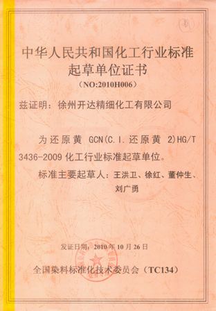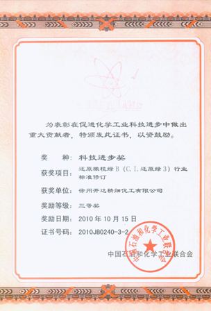 為促進整個行業(yè)產(chǎn)品質(zhì)量的提高和穩(wěn)定,我公司主持制/修訂了12項還原染料產(chǎn)品標準和1項方法標準,標準中多項指標達到國際領(lǐng)先水平。將為提升我國染料行業(yè)產(chǎn)品檔次和附加值,減少下游客戶在使用過程中的三廢排量起到積極作用。其中2項標準獲得了中石化科學(xué)進步三等獎。修訂了3個還原染料的生產(chǎn)安全技術(shù)規(guī)范,修訂后的標準成為行業(yè)強制標準。為加強企業(yè)安全生產(chǎn)監(jiān)督管理,防止和減少生產(chǎn)安全事故的要起到了指導(dǎo)作用。