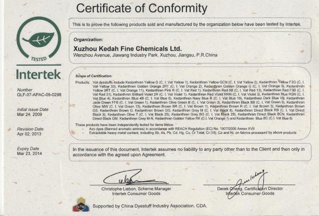 我公司主要產(chǎn)品每年進(jìn)行“化學(xué)品安全環(huán)保測試”。連年獲得INTERTEK公司(國際三大檢測認(rèn)證機(jī)構(gòu)之一)頒發(fā)的還“染料生態(tài)安全證書”。2010年,成為INTERTEK公司在中國首次授權(quán)生態(tài)標(biāo)簽的10個(gè)企業(yè)之一。這在肯定我公司對于“產(chǎn)品生態(tài)安全”的控制和管理能力的同時(shí),也標(biāo)志著我公司在生態(tài)環(huán)保安全等方面處在了行業(yè)領(lǐng)先地位。